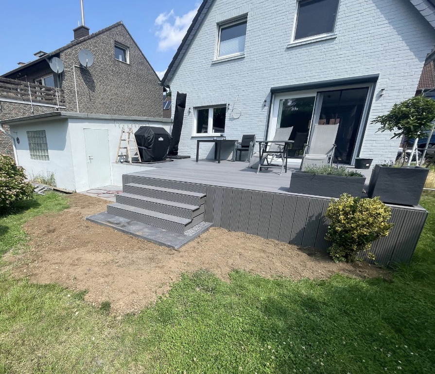 • Im Anschluss erfolgte die Neugestaltung der Terrasse mit langlebigen WPC-Dielen. Diese verleihen dem Außenbereich eine pflegeleichte, moderne und