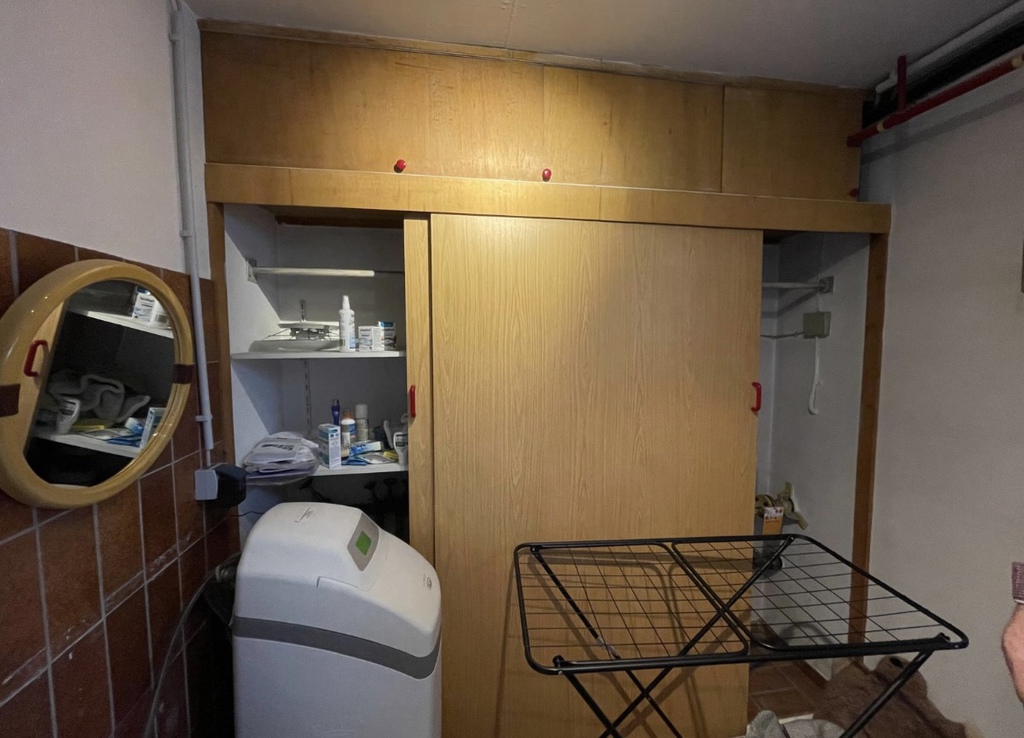 Neue Fliesen, ein frischer Anstrich – inklusive der Aufarbeitung des alten Holzschranks mit Schiebetür – verleihen der Waschküche ein völlig neues